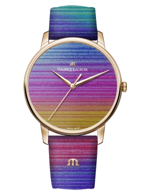 Модель Eliros Rainbow выглядит роскошно в крупном корпусе диаметром 40 мм с PVD-покрытием оттенка розового золота. Цветной ремешок с голографическим эффектом и логотипом MauriceLacroix в виде буквы «M» может быть легко заменен благодаря оригинальной системе крепления easy-change. Данная модель лимитирована выпуском в 1000 экземпляров.