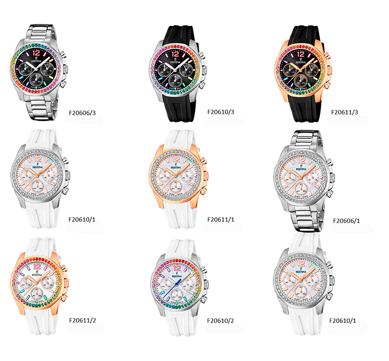 Festina всегда была внимательна к новым тенденциям, и с моделями своей линии Rainbow она обращается к женщинам, идущим в ногу со временем, смелым и не боящимся сильных контрастов. Хронографы, традиционно ассоциирующиеся со спортом и имеющие функциональный дизайн, были переосмыслены брендом и стали престижным элементом женского запястья.