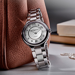 1. Frederique Constant Classics Delight Automatic FC-306WHD3ER6B Корпус из полированной нержавеющей стали. Циферблат с отделкой серебристым перламутром по цифровому полю и белым узором гильоше по центру. Центральные стрелки и римские цифры из полированной нержавеющей стали, восемь бриллиантов в виде условных индексов, прямоугольное окошко даты. 3-рядный браслет из нержавеющей стали. Раскладывающаяся стальная застёжка. |