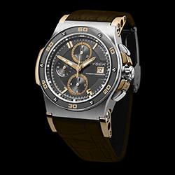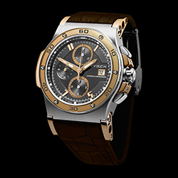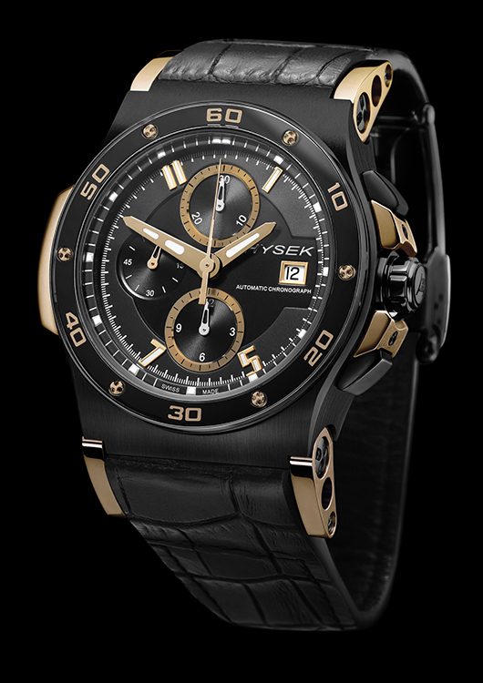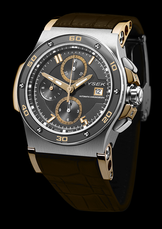 Новые автоматические хронографы «Hysek Abyss 44mm Chronograph 10th Anniversary Titanium and Rose Gold» комплектуются ремешками из кожи аллигатора коричневого или чёрного цвета с фирменной складной титановой застёжкой «Hysek».