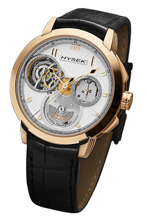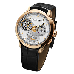 Завершают облик модели фирменные черты Hysek. В верхней части циферблата выделены цифры 11 и 1, как на большинстве моделей, произведенных в стенах мануфактуры. Расположение открытых участков в этот раз производитель пересмотрел. Турбийон занял место на 10-часовой отметке — эта необычная позиция придает хронографу элегантную взвешенность.