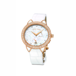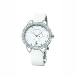 На перламутровом циферблате, который защищён сапфировым стеклом с антибликовым покрытием, расположены золотые центральные стрелки часов и минут, условные часовые индексы, роль которых играют прозрачные бриллианты, а также индикатор запаса хода механизма на отметке «2 часа», секундный циферблат – чуть выше отметки «6 часов» и указатель даты на месте отметки «6 часов».