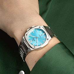 Женская версия выполнена в нежно-голубом оттенке, а мужская — в насыщенном синем. Оба варианта комплектуются интегрированными браслетами с выразительным средним рядом звеньев. Эти часы станут не только утонченным аксессуаром, но и символом единства — стиля, вкуса и чувств.