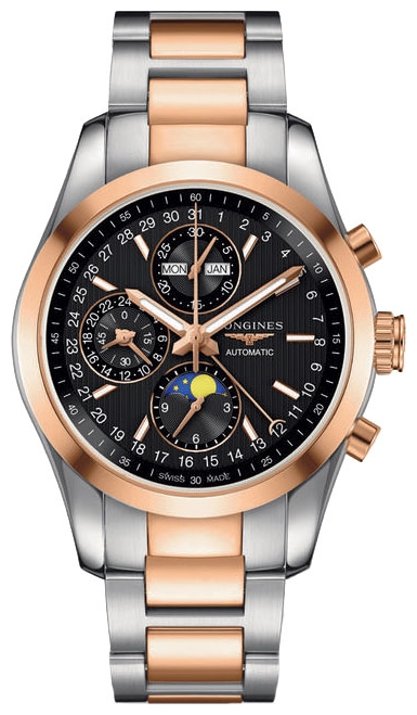 4. Longines Conquest Classic Moonphase L2.798.5.52.7: стальной корпус и стальной браслет, безель, заводная головка, пушеры и звеньями центрального ряда браслета – 18-каратное розовое золото, чёрный циферблат. | |