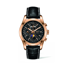5. Longines Conquest Classic Moonphase L2.798.8.52.3: золотой (розовое золото 18 карат) корпус, чёрный циферблат, чёрный кожаный ремешок. | |