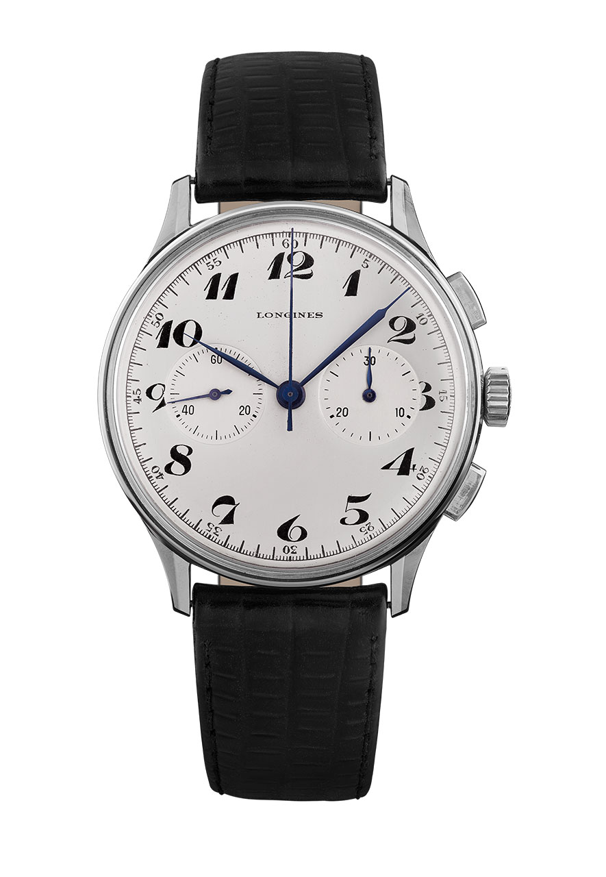 Повторяя дизайн исторической модели, новый хронограф имеет выпуклый серебристо-белый циферблат с двумя искусно выполненными счетчиками: один на 30 минут, второй – для малой секундной стрелки. Гармоничные арабские цифры в характерном для того периода курсивном шрифте «dolphin» придают этим часам неповторимый облик. На циферблате у отметки «12 часов» символами в античном стиле изящно нанесена надпись «LONGINES». Подчеркивают красоту этих элегантных часов синие стальные стрелки листообразной формы под сапфировым стеклом с антибликовым покрытием.
