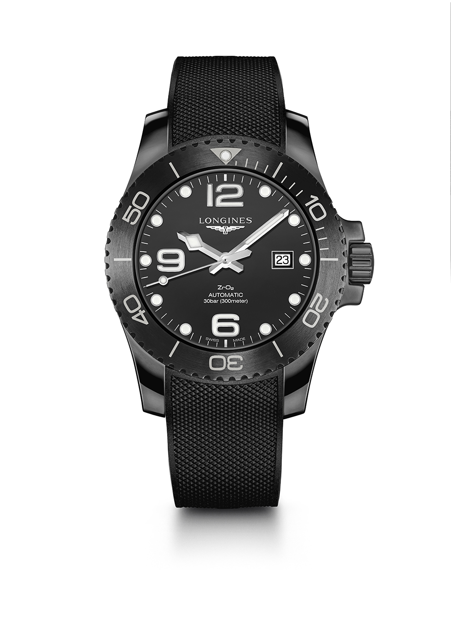 Недавно часовая компания Longines представила новые изящные модели из коллекции HydroConquest, безель которых украшен цветной керамической вставкой. Сегодня бренд пошел еще дальше в использовании этого эксклюзивного материала и выпустил модель, полностью изготовленную из черной керамики. На циферблате указан химический состав – ZrO2. Этот высокотехнологичный и устойчивый к царапинам материал идеально подходит к спортивному образу новых часов HydroConquest от Longines. Смелый дизайн подчеркивает каждая деталь: матовый циферблат, глянцевый корпус, круглый сатинированный безель и задняя крышка, сочетающая сатинированный фон и матовую отделку.