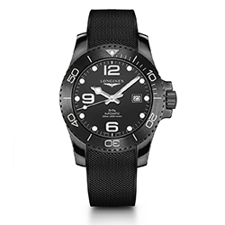 Корпус диаметром 43 мм с тремя стрелками и календарем оснащен механизмом с автоподзаводом (калибр L888.3), разработанным специально для Longines. Белый цвет меток и стрелок, имеющих покрытие Super-LumiNova®, контрастирует с глубоким черным циферблатом. Новый HydroConquest дополнен черным каучуковым ремешком с возможностью точной регулировки размера для оптимального комфорта.