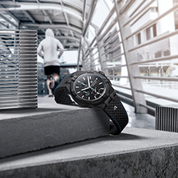 Стальной корпус диаметром 44 мм с черным PVD-покрытием подчеркивает как выразительный дизайн, так и спортивный характер этой модели. Черный циферблат с сатинированием в виде солнечных лучей завораживает. Он оснащен указателем даты и тремя счетчиками со спиральным узором. Три счетчика – 30-минутный в положении «9 часов», счетчик 1/10 долей секунды в положении «12 часов» и малая секундная стрелка в положении «6 часов». Часовая и минутная стрелки родированные, с белым люминесцентным покрытием SuperLuminova. Цветовые акценты в этой модели расставляют центральная секундная стрелка хронографа, счетчики и минутная шкала, выполненные в небесно-голубом цвете.