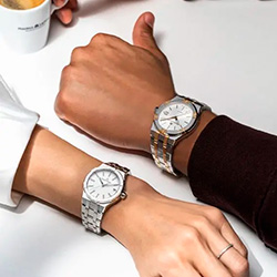 Maurice Lacroix также представляет новый двухцветный AIKON, представленный в корпусе диаметром 40 мм. Шесть рычагов, охватывающих безель из нержавеющей стали, отделаны золотом 4N PVD, что придает композиции теплоту. Серебристый циферблат, матовый от солнца, служит фоном для золотых стрелок и индексов, которые ярко сияют даже в пасмурный день. Отверстие для даты в положении «3 часа» также обрамлено золотом 4N PVD, что усиливает общее ощущение роскоши. Наконец модель представлена на пятирядном двухцветном браслете, завершающем образ этого стильного ансамбля.