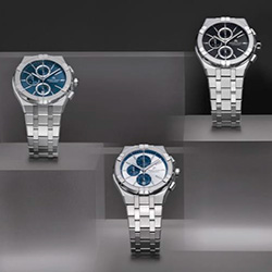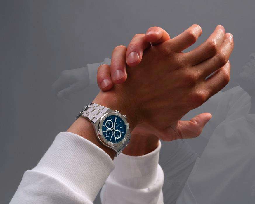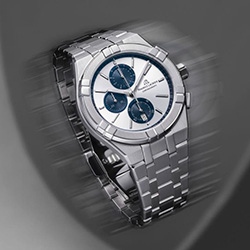 AIKON Quartz Chronograph доступен в трех вариантах циферблатов: классический черный, океанический синий и серебристый, с контрастными синими счетчиками. Каждый циферблат идет с уникальной обработкой, которая завораживающе «играет» со светом, придавая часам дополнительный шарм и изысканность.