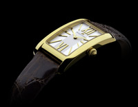Для часов с корпусом из нержавеющей стали с жёлтым PVD-напылением и серебряным циферблатом предлагается коричневый ремешок из кожи аллигатора или браслет из нержавеющей стали с жёлтым PVD-напылением, с такой же по качеству застёжкой.