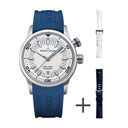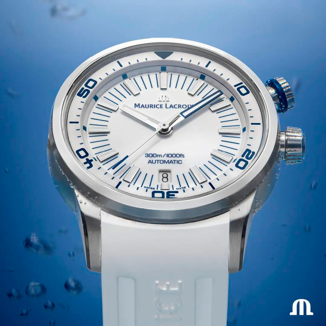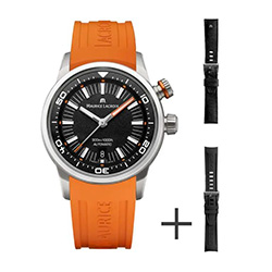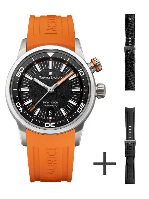 Для презентации стальные модели поставляются с тремя ремешками, согласованными по цвету: тканевым ремешком марки M и двумя резиновыми ремешками с рельефным логотипом Maurice Lacroix. Часы оснащены фирменной системой легкой замены ремешка без использования инструментов.