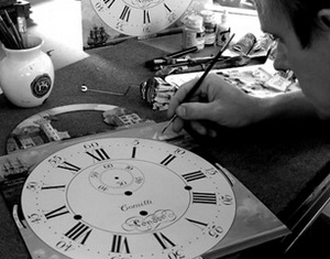 На диск часов наносится эмаль, на эту эмаль трафаретом наносится циферблат, затем художник добавляет иные декоративные детали. С использованием акриловых красок и очень тонких кисточек рисунок добавляется в уголки, затем на арку, лунный календарь или на движущиеся фигуры.