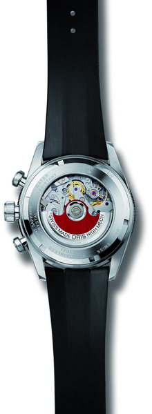 Круглый по форме, сборный стальной корпус, диаметром 44 мм, определяет сдержанный и невозмутимый характер часов. Спортивная тема часов определила наличие на верхней части корпуса такой детали, как вращающийся в обоих направлениях ободок с чёрным керамическим кольцом. На внешнюю сторону ободка нанесено каучуковое покрытие, оно обеспечивает хороший тактильный контакт с ободком и позволяет плавно и точно устанавливать нанесённую на него минутную шкалу. Стальная, фиксируемая на резьбе, заводная головка, стальные кнопки хронографа и ушки часов, также выполненные из стали, - завершающие штрихи конструкции корпуса, тыльную сторону которого закрывает завинчивающаяся задняя крышка с прозрачным окошком из минерального стекла, сквозь которое хорошо виден фирменный ротор Oris красного цвета.
