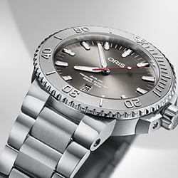 Источником вдохновения в разработке дизайна часов Oris Aquis Date Relief послужил цвет воды и его восприятие. Серый циферблат напоминает цвет штормового моря, а фирменные рельефные маркеры дайверской шкалы окружены фактурной поверхностью как напоминание водной ряби.