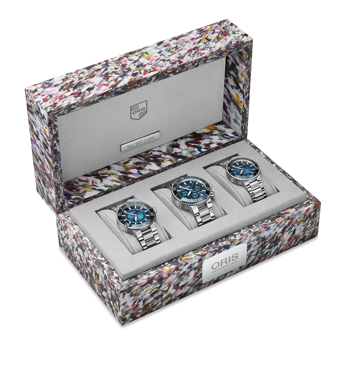 Модель Oris Clean Ocean Limited Edition ознаменовала собой партнерство с организацией Pacific Garbage Screening, которая работает над проектом задержания пластиковых отходов в реках и эстуариях до того, как они попадут в океан. Проект подразумевает строительство специальных плавучих платформ, на которых отходы будут преобразовываться в энергию. Комплект Oris Ocean Trilogy поддерживает три проекта, имеющих огромное значение для здоровья наших океанов. Комплект выпущен в количестве 200 экземпляров и представлен в специальных шкатулках, изготовленных из переработанного ПЭТ-пластика.