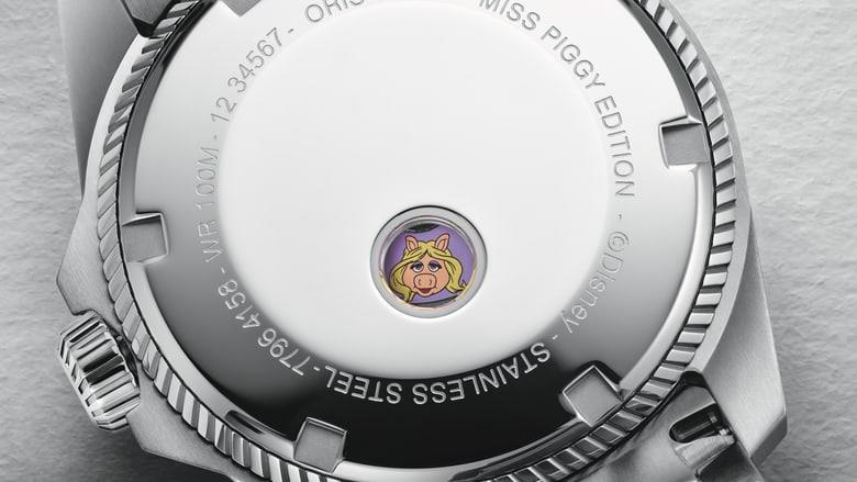Корпус диаметром 34 мм выполнен из нержавеющей стали, а розовый циферблат украшен бриллиантом багетной огранки на отметке «12 часов». Сквозь заднюю крышку с гравировкой можно увидеть миниатюрный портрет Мисс Пигги - кокетливый акцент для коллекционеров и поклонников стиля.