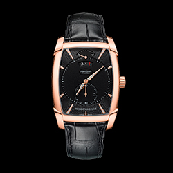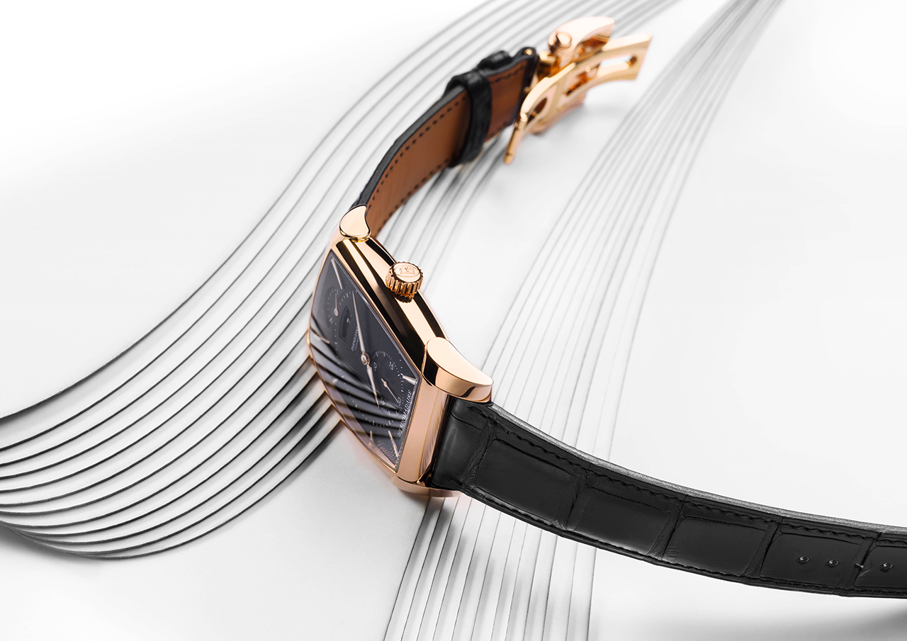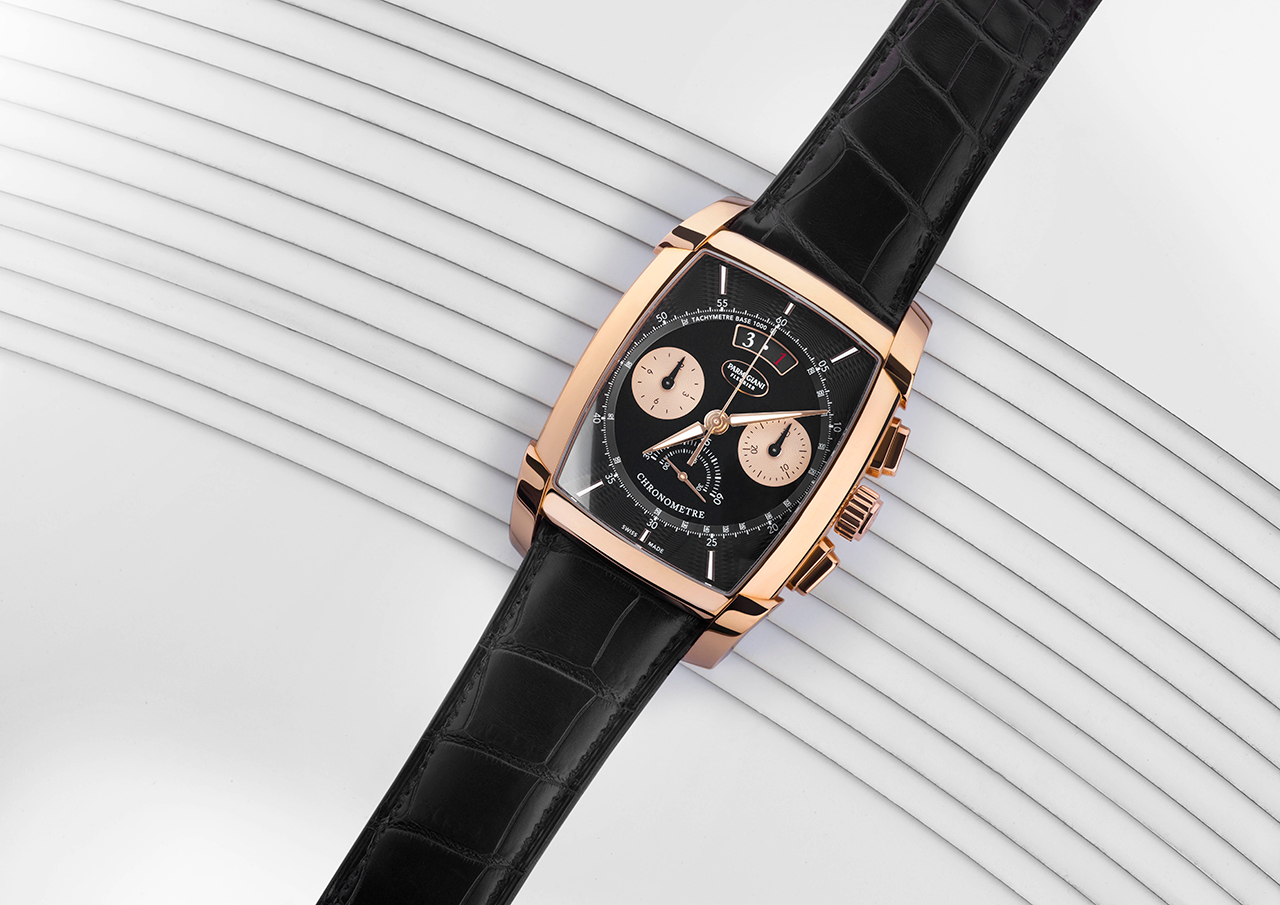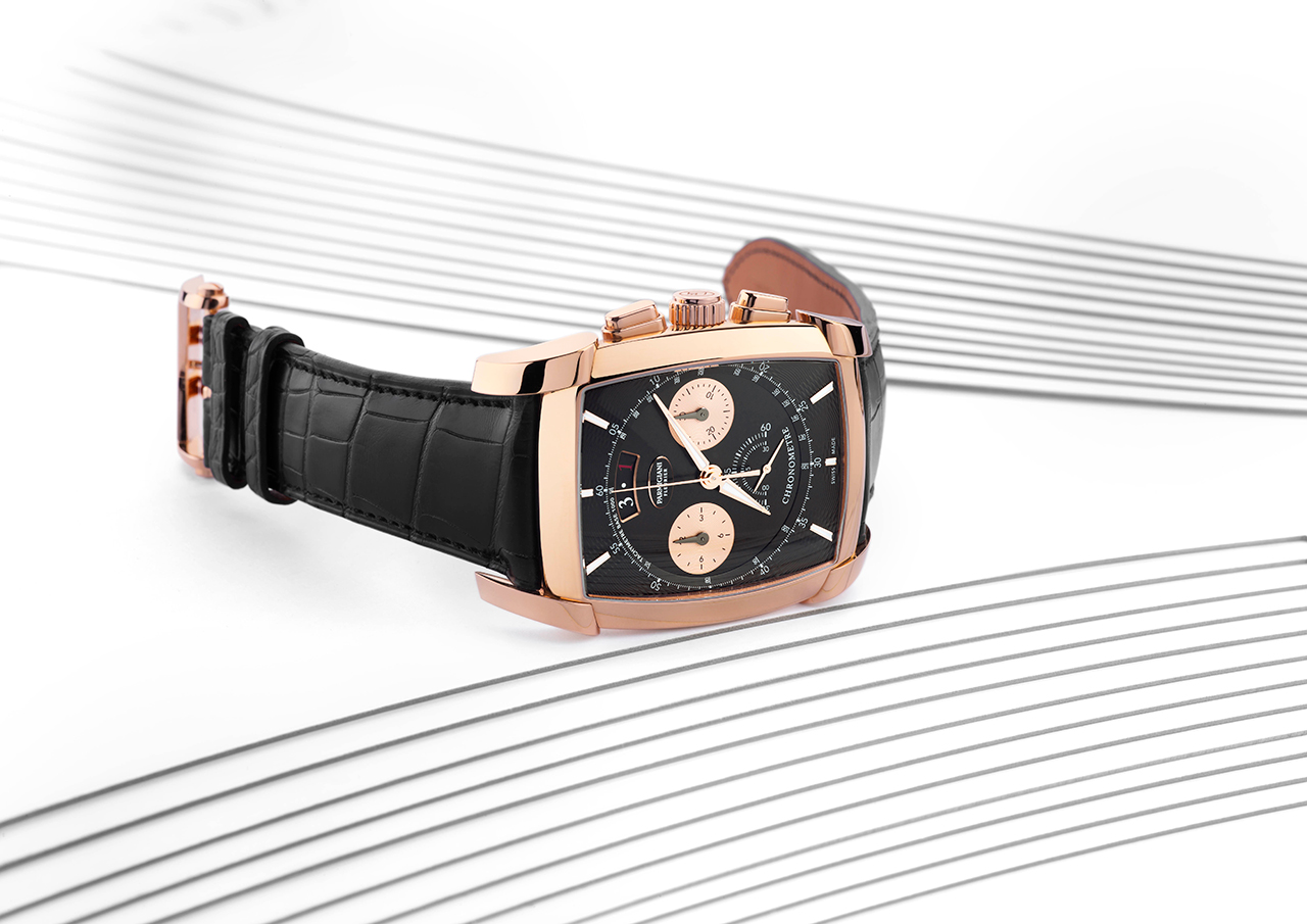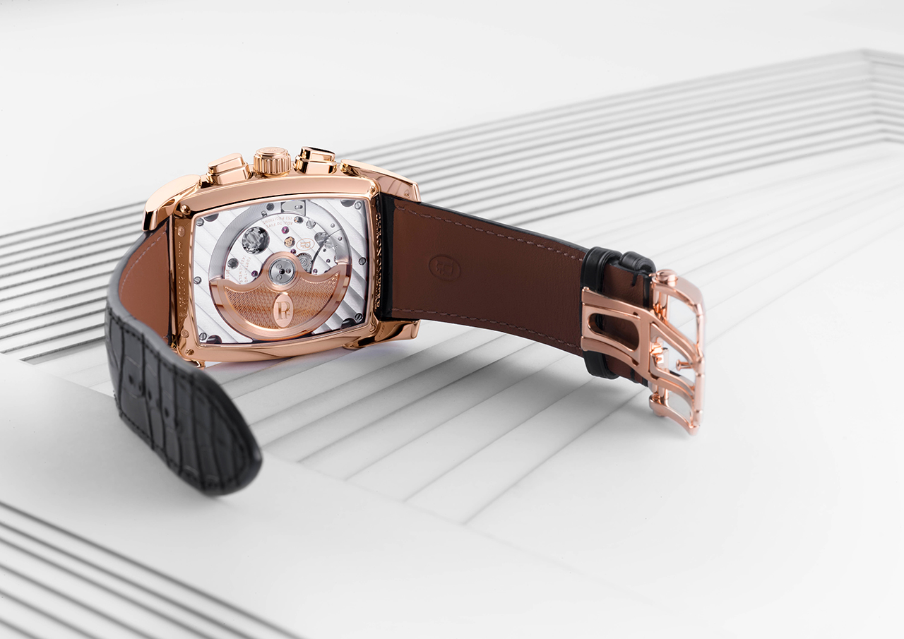 На проектирование и производство этого калибра у специалистов Дома ушло шесть долгих лет. Он работает с частотой 36000 полуколебаний в час (5 герц) и показывает время с точностью до десятых долей секунды. Делает он это с помощью колонного колеса и вертикального сцепления, повышающих точность хронографической функции и удобство при работе с ней. В дополнение к перечисленному здесь имеется балансовое колесо с регулируемой инерцией, закрепленное на мосту. Оно обеспечивает стабильность его колебаний и устойчивость к внешним воздействиям. Идеально вписанный в полированный вручную бочкообразный корпус размерами 48,2х40,4 мм, водонепроницаемый до глубины 30 метров, этот передовой механизм демонстрирует свой элегантный декор. В частности, это ротор автоподзавода из 22-каратного золота с «зерновым» гильоше. Циферблат разделен на несколько уровней. Матированный центр покрыт синим PVD-напылением, а края украшены узором гильоше и размечены накладными, установленными вручную фацетированными метками. Два счетчика, покрытых круговым узором, обрамлены золотыми ободками. Вокруг них идет под углом тахиметрическая шкала, над ними расположена апертура указателя даты, а под ними – две секторные секундные шкалы с двусторонней стрелкой. Покрытые люминофором стрелки формы Delta, слегка смещенные вверх от центральной оси счетчики и изогнутое окно указателя даты формируют легко читаемый циферблатный интерфейс. Завершает картину черный ремешок из кожи аллигатора с раскладывающейся застежкой из розового золота.