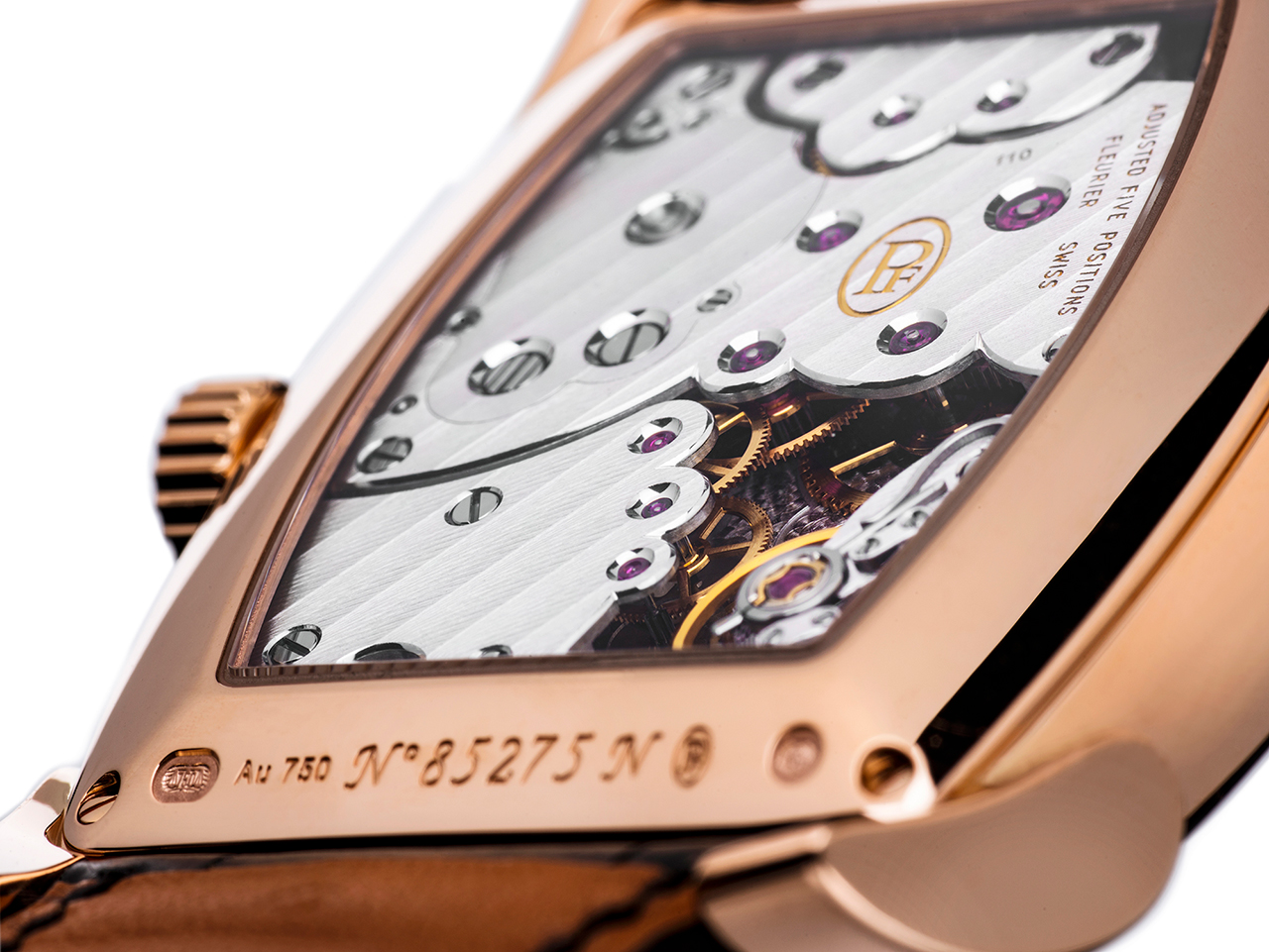 Что касается функций PF365, то на циферблате присутствуют часовая и минутная стрелки, малый секундный счетчик, а также счетчики хронографа со шкалой тахиметра и окном указателя даты. С обратной стороны бочкообразный калибр закрыт крышкой из сапфирового стекла, позволяющей рассмотреть его в деталях (включая украшенный гильоше «ячменное зерно» ротор автоподзавода из 22-каратного золота). Двухуровневый черный циферблат из 18-каратного золота матирован по центру, гильоширован по краям и дополнен двумя вспомогательными счетчиками с круговым узором.