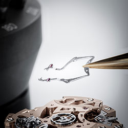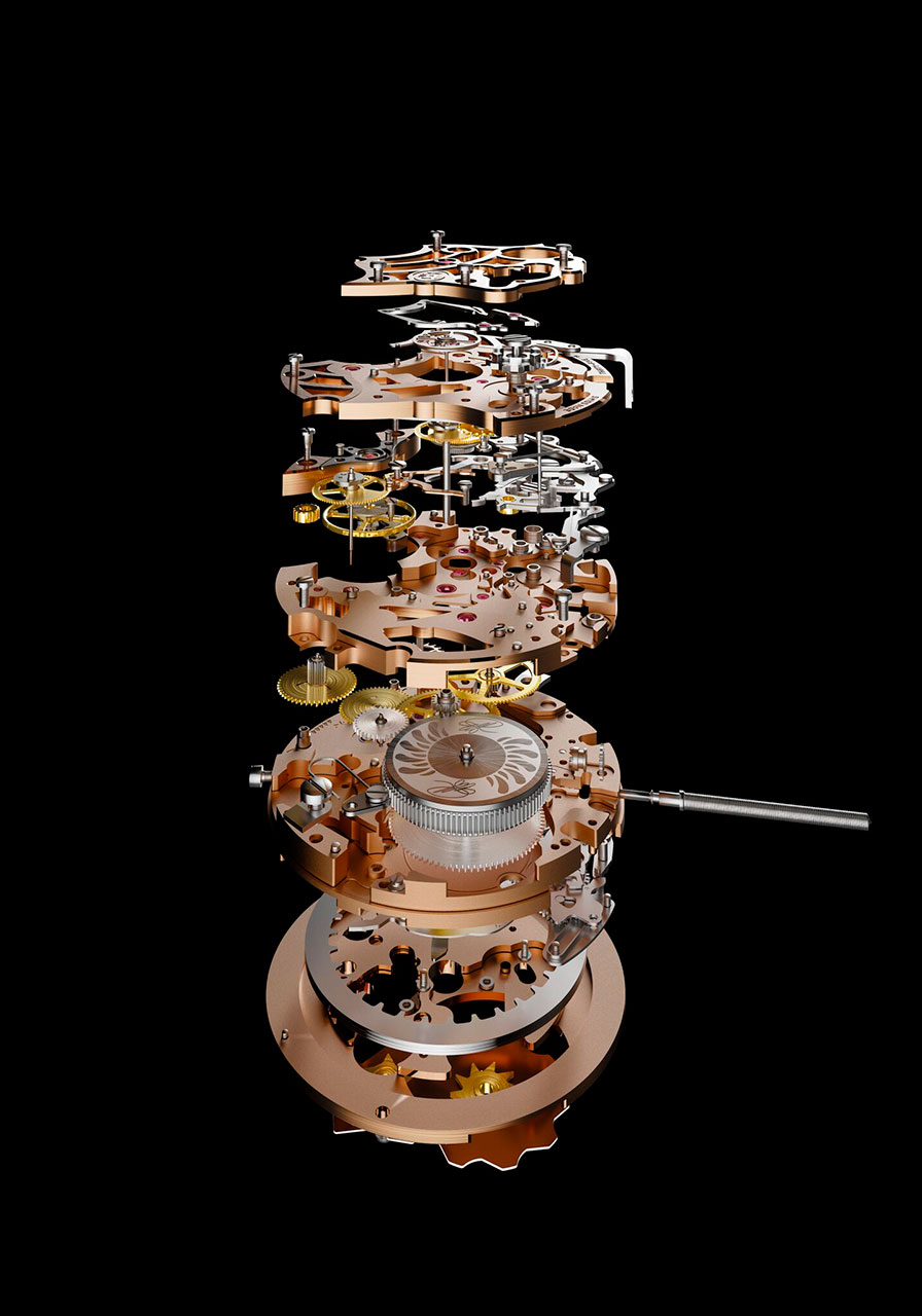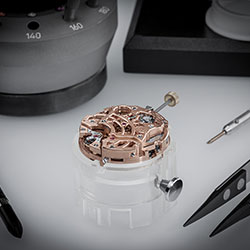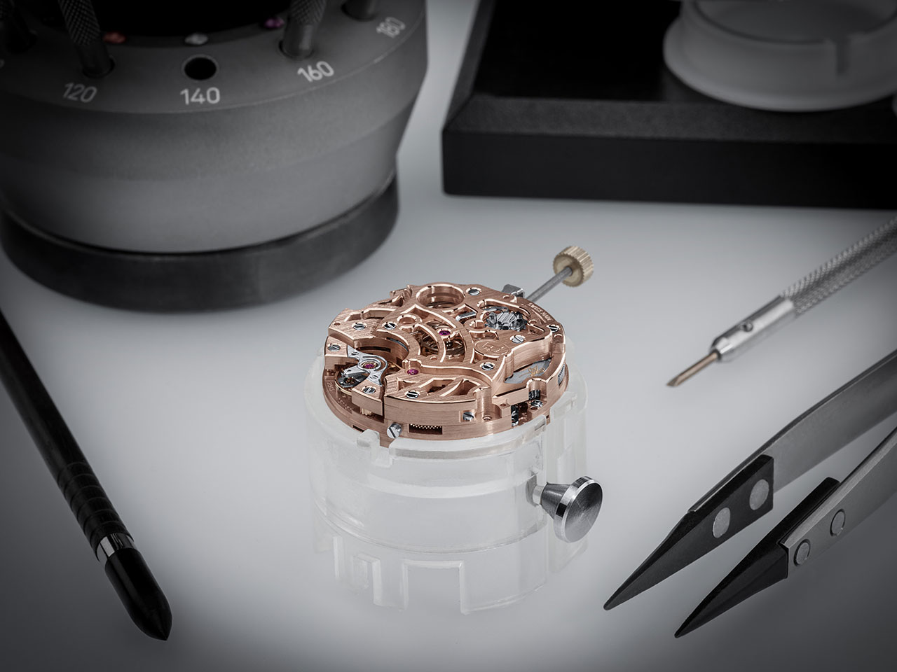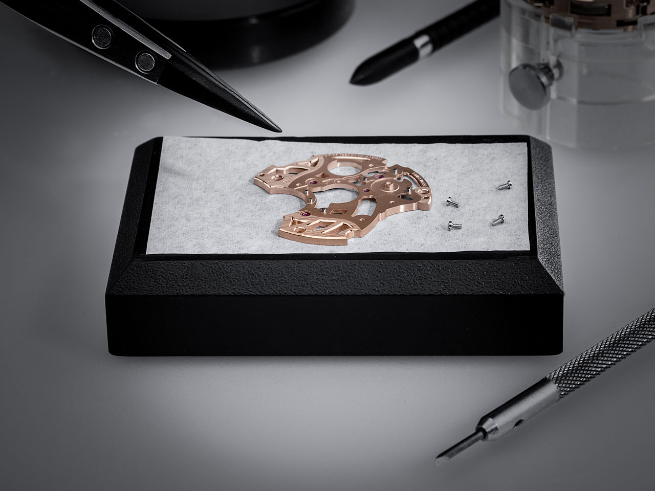 Декорирование золота не менее сложно технически и требует более 50 рабочих часов на одну единицу. Каждый часовой механизм имеет концентрический вырез на мостах вокруг баланса. Выделенный таким образом баланс становится центром механического спектакля. Мосты ажурированы специально для того, чтобы были виден механизм, «пульсирующий» на их фоне, и два колонных колеса, расположенных симметрично по отношению к оси заводной головки. Свой вклад в общую картину вносят зерненые и сатинированные элементы, а также внутренние углы на мостах, на которых играют лучи света, подчеркнутые отблесками золота.