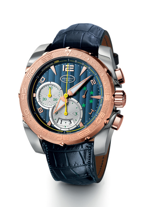 Премьерная модель часов "Parmigiani Pershing Chronographe 005 CBF" из стали и розового золота сочетает в себе золотой, синий и зелёный цвета, которые присутствуют в официальной символике Бразильской конфедерации футбола.
