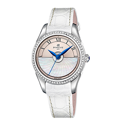 1. Модель A2065/4: циферблат из белого перламутра, оригинальные римские цифры, двойной ротор в форме ажурных лепестков с бриллиантовой отделкой – 19 бриллиантов (0,04 карата) Top Wesselton, VS1, белый ремешок из кожи аллигатора. | |