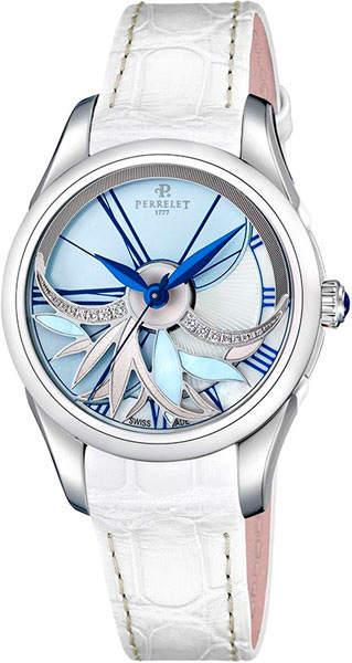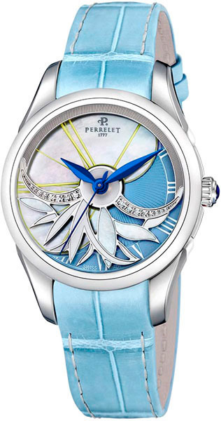 Циферблаты выполнены в двух вариантах: синим, с акцентом из белого перламутра и светло-голубым с фиолетово-синими римскими цифрами. Модель комплектуется кожаным ремешком из кожи аллигатора или стальным браслетом, в зависимости от цветовой гаммы. Часы сочетают в себе художественное ремесло и современное часовое искусство, что делает их идеальным выбором для женщин с безупречным вкусом.