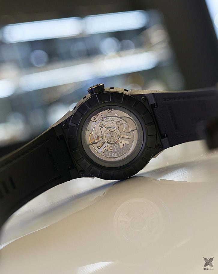 - Задняя крышка из нержавеющей стали с черным PVD покрытием и сапфировым стеклом.