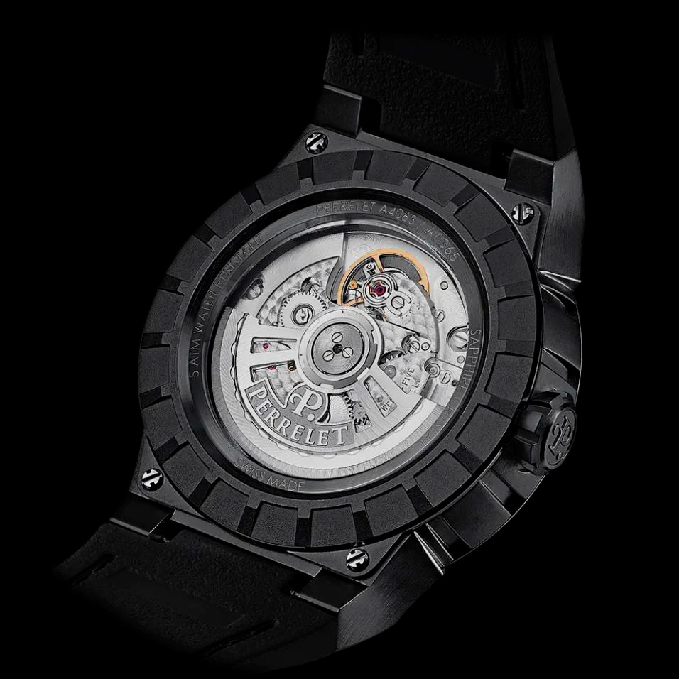 Часы заключены в корпус из нержавеющей стали с изысканным черным PVD-покрытием. Диаметр корпуса составляет 44 мм, а толщина — 13,82 мм. Гладкий безель и рифленый боковой корпус добавляют часам утонченности, а логотип Perrelet гордо украшает заводную головку. Двойное антибликовое сапфировое стекло защищает как циферблат, так и заднюю крышку, позволяя легко рассмотреть детали механизма. Водонепроницаемость часов достигает 5 АТМ, что делает их подходящими для повседневной носки в любых условиях.