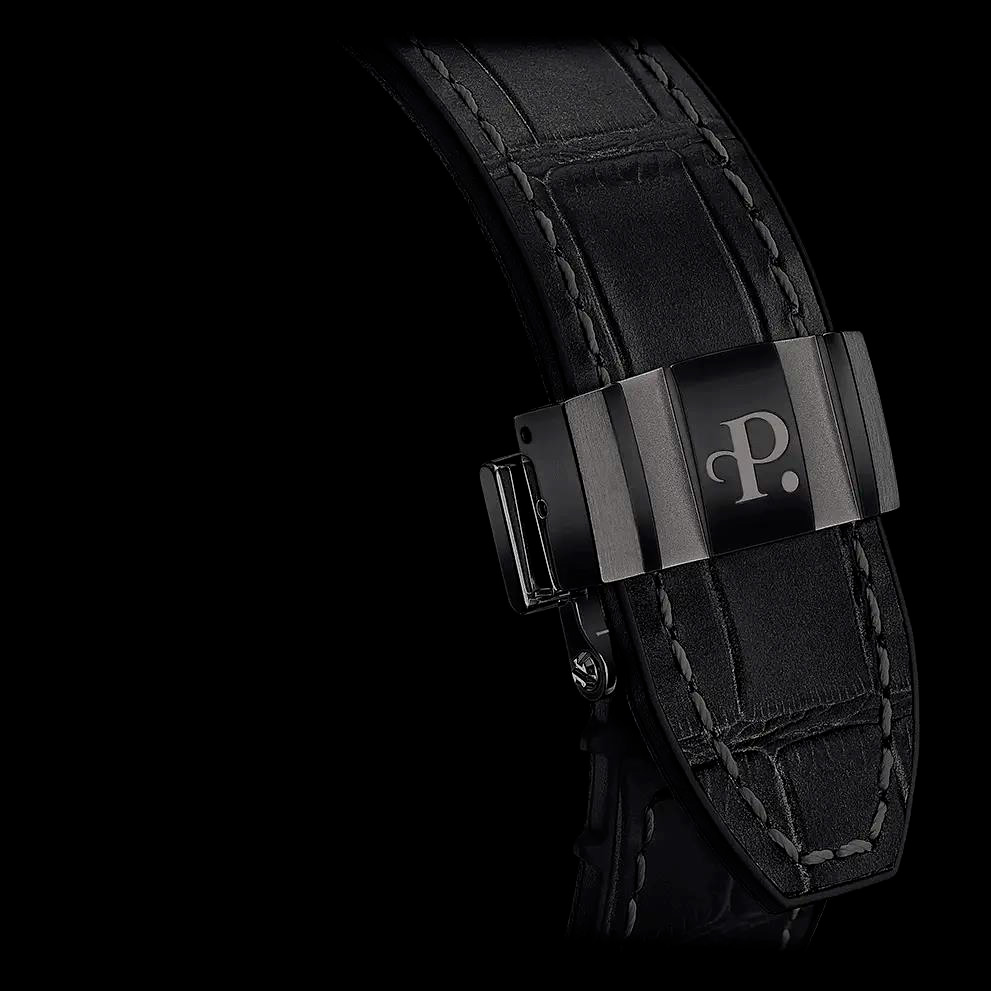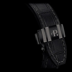 Часы укомплектованы ремешком из телячьей кожи, украшенным узором под крокодила и с внутренней подкладкой из черной резины, что обеспечивает дополнительный комфорт и долговечность. Черная PVD-пряжка из нержавеющей стали с гравировкой Perrelet гарантирует надежную фиксацию и дополняет общий элегантный облик часов.