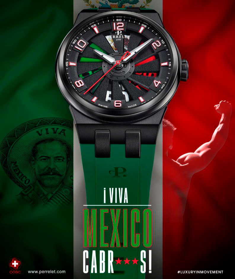 Швейцарская мануфактура Perrelet с гордостью представляет свою новую модель — TURBINE «VIVA MÉXICO, CABRONES!». Эта ограниченная серия из 50 экземпляров создана в честь мексиканской независимости и отражает как традиции, так и современный стиль. Часы соединяют в себе уникальный дизайн и высокие технологии, предлагая своим обладателям не просто инструмент для измерения времени, а произведение искусства, наполненное страстью и гордостью.