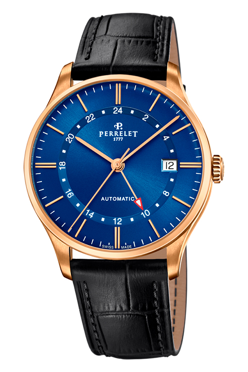 - Черный кожаный с выделкой под аллигатора и с классической застежкой с логотипом Perrelet.