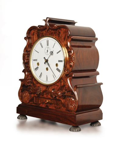Благородный корпус из вишни с изящно изогнутыми стенками и дверцей, маленький ящик для ключа, открытый серебряный циферблат с секундной стрелкой, стрелки в стиле Бреге.