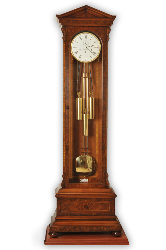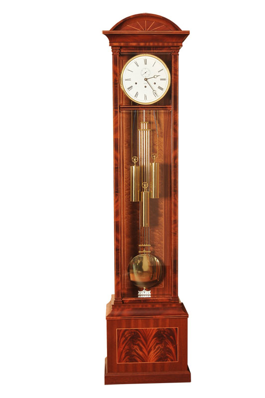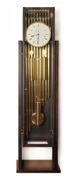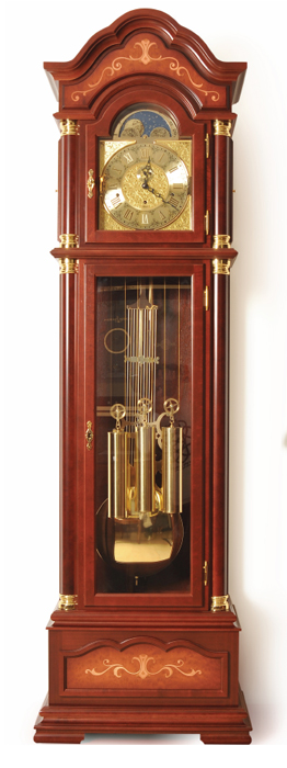 Классический корпус из красного дерева с инкрустацией кленом, хрустальное стекло и эмалированный циферблат с дополнительным секундным циферблатом. Полированный компенсационный маятник, стрелки в стиле Бреге. Полированный, тросовый подвес гирь, бой каждую четверть часа, мелодия Westminster, 8-ми стержневой гонг, автоматическая регулировка равномерности хода, реальные секунды, автоматическое ночное отключение мелодии и боя с 22.00 до 07.15. Производство: Германия