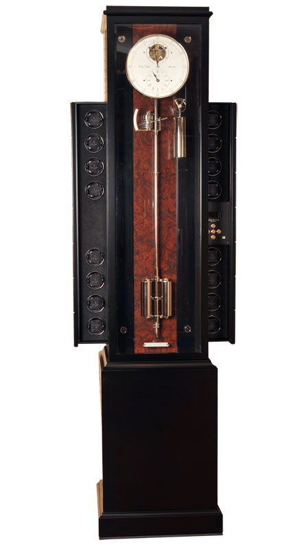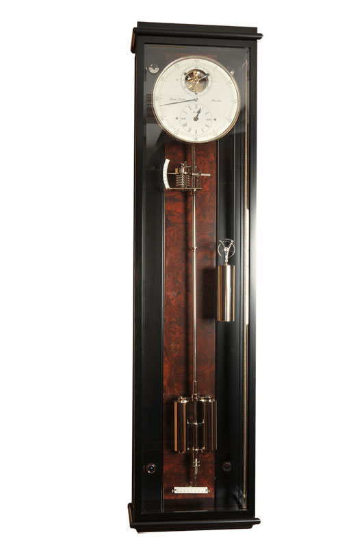 Высокоточный механизм с тросовым подвесом гири, с 8 рубинами и 6 бронзовыми втулками, автоматическая регулировка равномерности хода. Производство: Германия