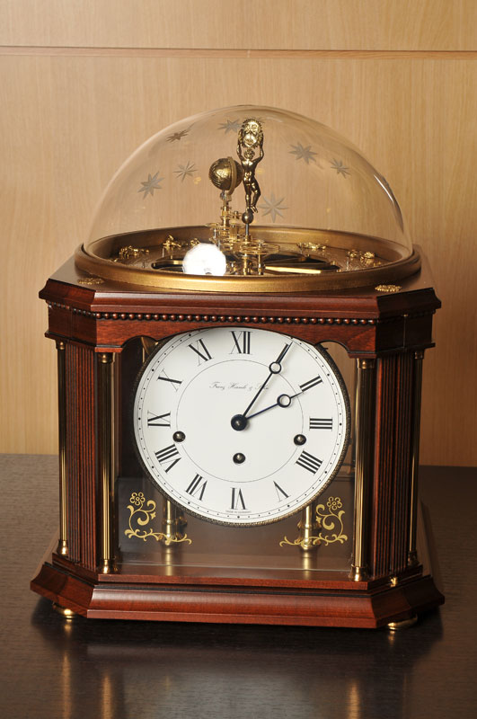 Модель Теллуриум III является новой разработкой из ряда "Теллуриум". Механизм с 8-ми дневным заводом, 11-ю камнями, мелодией Westminster каждую четверть часа, бой каждый час по количеству часов, автоматическое ночное отключение боя. Корпус часов изготовлен из массива дерева с отделкой под старину, фронтальная и задняя стенка часов с открывающейся дверцей, декоративные латунные элементы сверху и колонны по бокам, стеклянный купол со звездами, выгравированными вручную. Сверху часов расположена модель солнечной системы, показывающая ход Солнца, Луны и Земли в течение года. В центре поворачивающаяся скульптурка бога солнца, на диске отображается дата, месяц и соответствующая им фигурка знака зодиака. Циферблат покрыт эмалью.