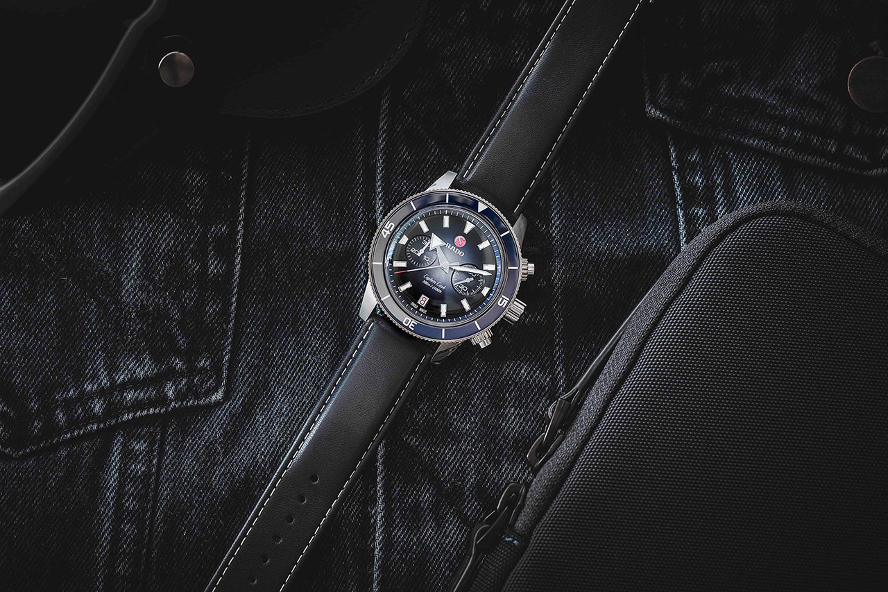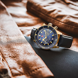Новая модель Captain Cook Chronograph оснащена выразительным сапфировым стеклом формы box-shaped, устойчивым к появлению царапин с двусторонним антибликовым покрытием. Более тонкий, комфортный и стильный корпус диаметром 43 мм из полированной нержавеющей стали или бронзы с круговой полировкой на выбор оснащен вставкой из высокотехнологичной керамики синего или черного цвета на безеле, прекрасно сочетающейся с цветом окантовки и циферблата соответствующей модели. Циферблат представлен в трех цветовых вариантах – градиент от серебристого к синему, от серебристого к черному или покрытие синего цвета с узором «солнечные лучи». Накладные деления, метки и цифры покрыты Super LumiNova® для еще лучшей видимости даже в условиях плохой освещенности. Стрелки также покрыты Super LumiNova® – в частности, массивная часовая стрелка со стрелообразным наконечником, прямая минутная стрелка, а также секундная стрелка хронографа с наконечником красного цвета гарантируют вам точность показаний независимо от времени суток и локации. Неотъемлемая деталь — символ движущегося якоря цвета родия на пластине красного цвета этих прочных и надежных часов, которые теперь также оснащены циферблатом хронографа на 9-часовом делении, стандартным секундным циферблатом на 3-часовом делении и окошком даты на 6-часовом делении. Дата, как и в предыдущих моделях, отображается в красном цвете на серебристом фоне. Внутри часов установлен более тонкий автоматический часовой механизм калибра R801 с 37 камнями, пятью стрелками и запасом хода 59 часов. Часы оснащены антимагнитной пружиной NivachronTM и отрегулированы в пяти положениях. Водонепроницаемость до 30 бар гарантирована за счет завинчивающейся заводной головки и утопленных кнопок.