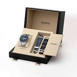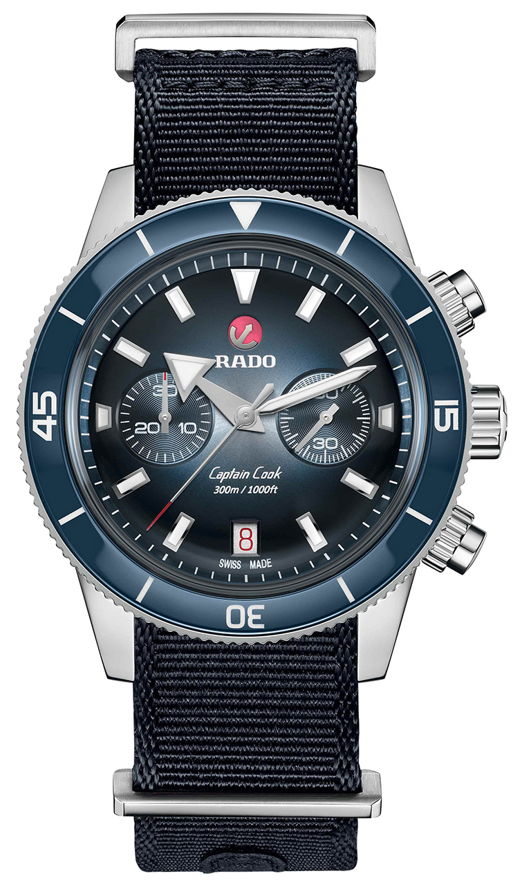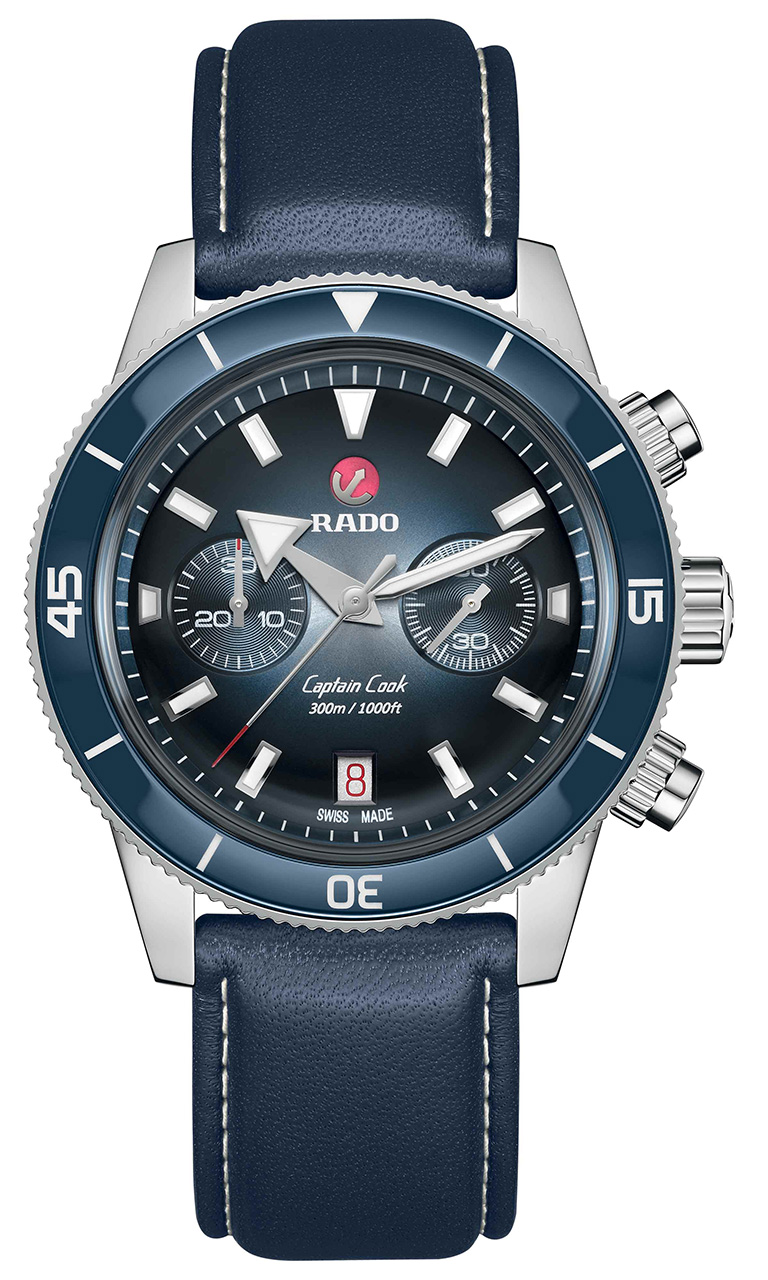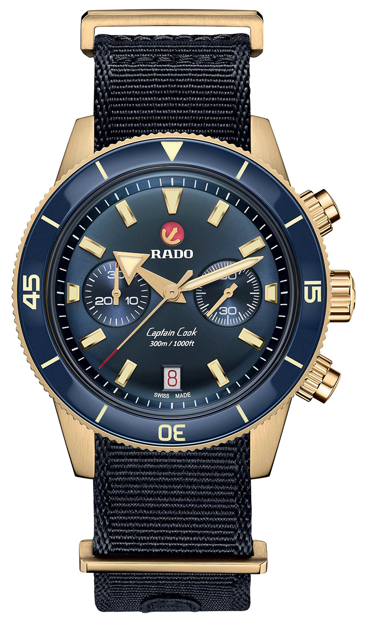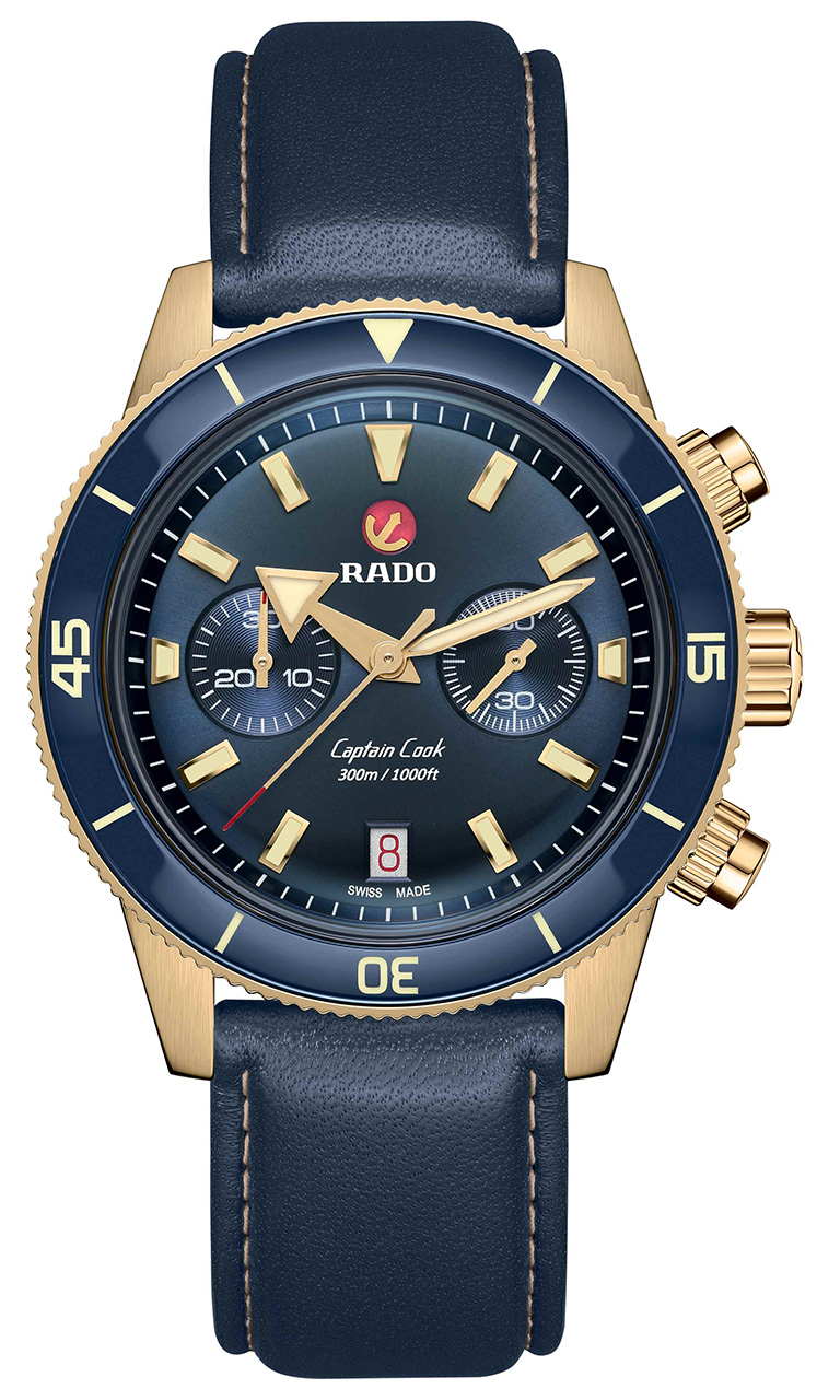 Новый хронограф Captain Cook, как и прежде, отличается неповторимыми характеристиками и поставляется с двумя дополнительными ремешками из различных материалов и оттенков – в зависимости от конкретной модели. Две стальные модели оснащены трехрядным браслетом из нержавеющей стали с матовыми центральными звеньями, дополнительным кожаным ремешком кофейно-коричневого или синего цвета с контрастной строчкой, а также спортивным тканевым ремешком NATO синего или черного цвета с застежкой из стали. Бронзовая модель представлена на ремешке NATO с линией золотистого цвета по центру, дополнена каучуковым ремешком синего цвета с акцентной строчкой и ремешком NATO темно-синего цвета с бронзовой застежкой. Для новых хронографов Captain Cook предназначен специальный чехол по образцу сундучка c ремешками для сокровищ, за которыми в прошлом охотились отважные мореплаватели и исследователи. Благодаря надежной внешней нейлоновой отделке деревянного футляра с металлической фурнитурой, его содержимому — запасным ремешкам и вашим любимым часам Rado — обеспечена полная сохранность на мягкой подкладке цвета слоновой кости, в то время, пока они не используются. Все выполнено в безупречном стиле и изготовлено с бескомпромиссной точностью.