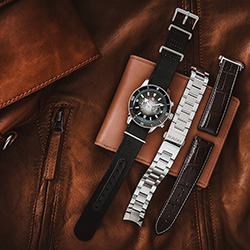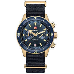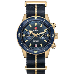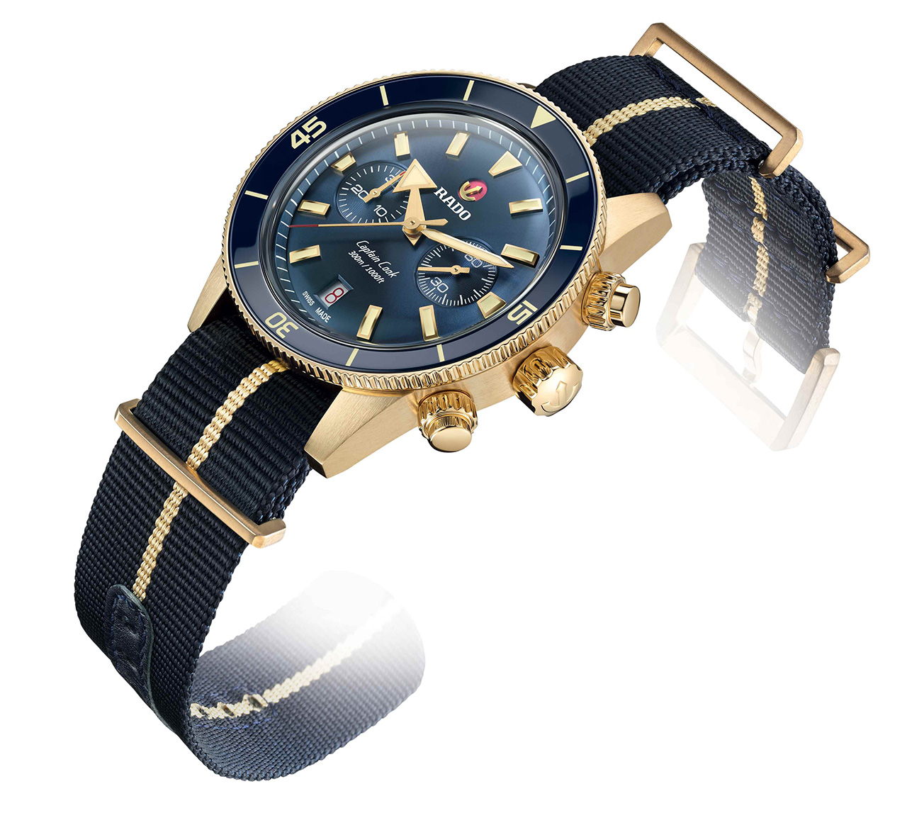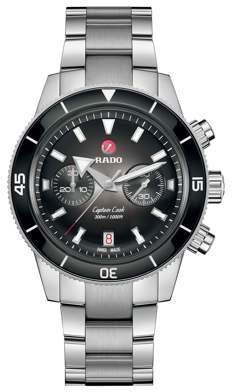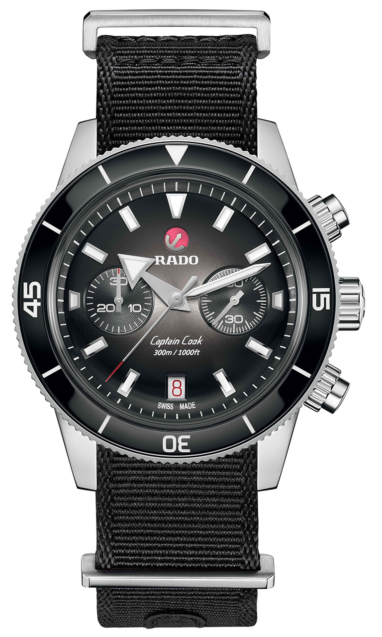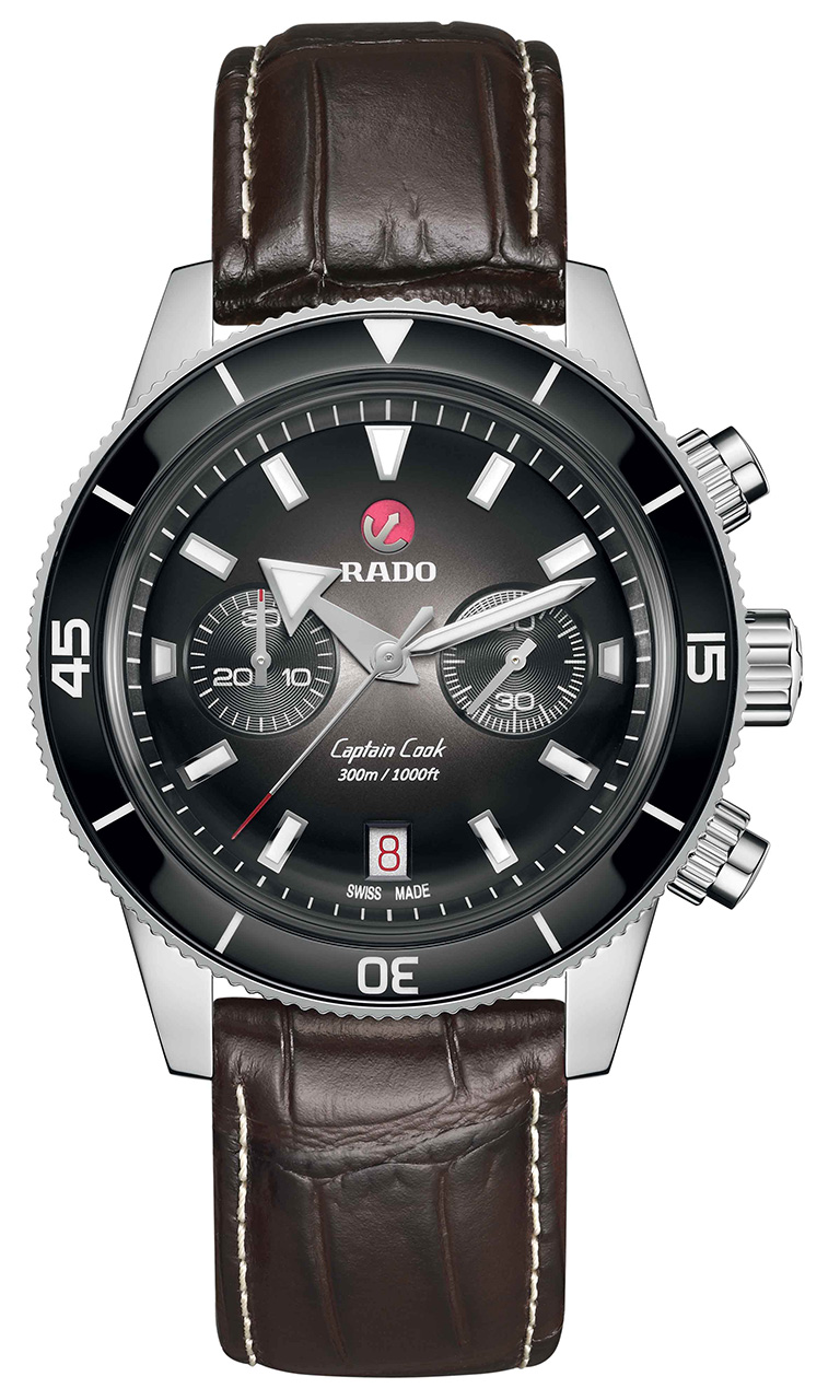 Новый хронограф Captain Cook, как и прежде, отличается неповторимыми характеристиками и поставляется с двумя дополнительными ремешками из различных материалов и оттенков – в зависимости от конкретной модели. Две стальные модели оснащены трехрядным браслетом из нержавеющей стали с матовыми центральными звеньями, дополнительным кожаным ремешком кофейно-коричневого или синего цвета с контрастной строчкой, а также спортивным тканевым ремешком NATO синего или черного цвета с застежкой из стали. Бронзовая модель представлена на ремешке NATO с линией золотистого цвета по центру, дополнена каучуковым ремешком синего цвета с акцентной строчкой и ремешком NATO темно-синего цвета с бронзовой застежкой. Для новых хронографов Captain Cook предназначен специальный чехол по образцу сундучка c ремешками для сокровищ, за которыми в прошлом охотились отважные мореплаватели и исследователи. Благодаря надежной внешней нейлоновой отделке деревянного футляра с металлической фурнитурой, его содержимому — запасным ремешкам и вашим любимым часам Rado — обеспечена полная сохранность на мягкой подкладке цвета слоновой кости, в то время, пока они не используются. Все выполнено в безупречном стиле и изготовлено с бескомпромиссной точностью.