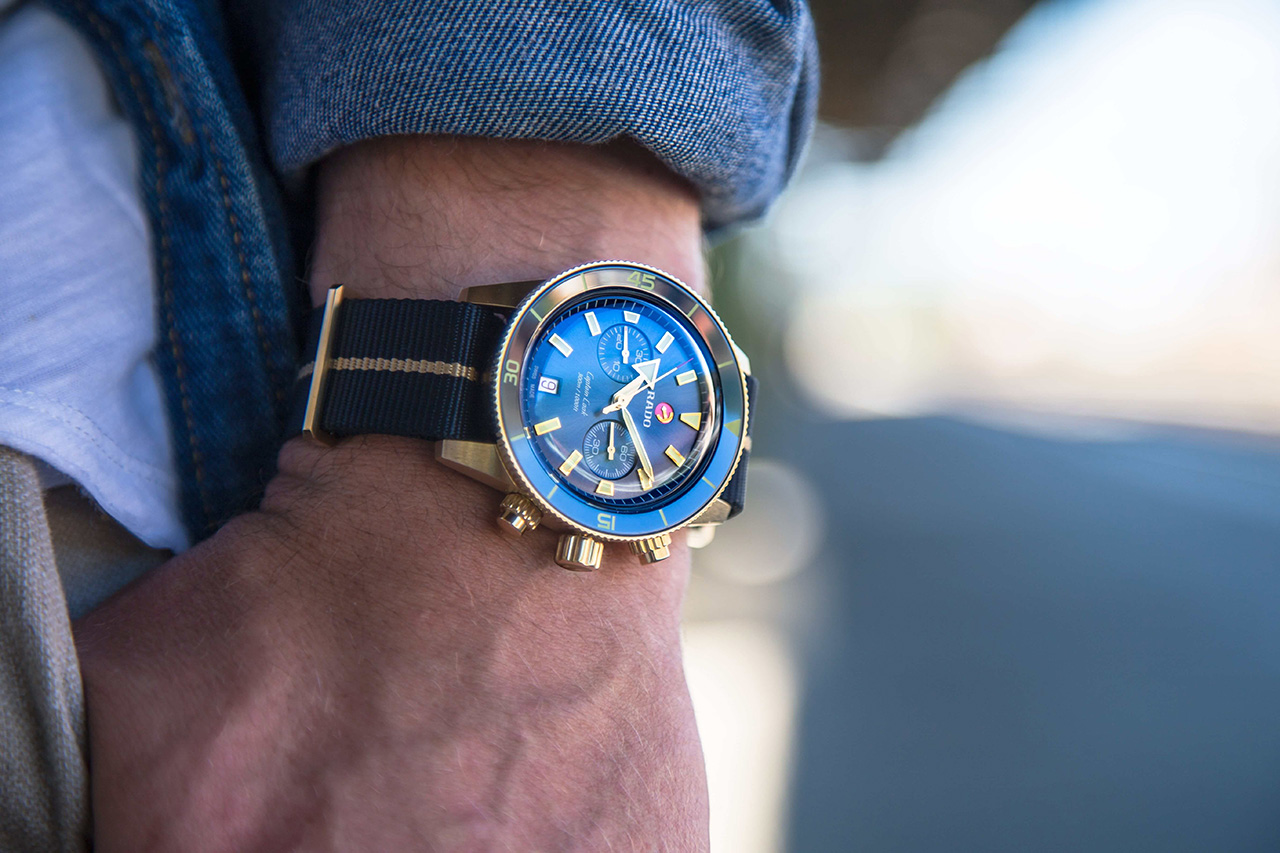 - Вращающийся безель из бронзы (CuAl) со вставкой из полированной высокотехнологичной керамики синего цвета, на которой выгравированы цифры, метки и треугольник, выделенные покрытием Super-LumiNova® желтого цвета в ретро-стиле.