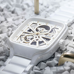 Rado True Square Open Heart (R27073722) - светлая праздничная противоположность. Белая высокотехнологичная керамика, мягко закруглённый квадратный корпус и полностью открытое «сердце» механизма R734 Open Heart создают ощущение воздушности. Сквозь сапфировое стекло на циферблате и в титановой задней крышке можно видеть перламутрово-белую платину и украшенный «женевскими волнами» держатель механизма. Лёгкий керамический браслет с шелковистой фактурой делает модель особенно приятной в повседневной носке.