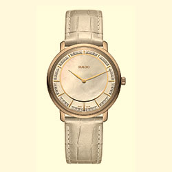 Фирменный материал Ceramos цвета розового золота — это удивительное сочетание, состоящее на 90% из высокотехнологичной керамики и на 10% из металлического сплава. Корпус конструкции моноблок имеет толщину всего 5,3 мм и диаметр 38 мм. Он отлично подойдет для запястья любой толщины. Перламутровый циферблат, украшенный 48 бриллиантами Top Wesselton, кожаный ремешок с перламутровым тиснением и корпус из материала Ceramos — так выглядит великолепное сочетание материалов от компании Rado.