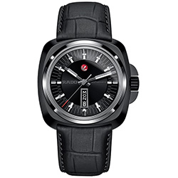2. Rado HyperChrome 1616 Ceramic Black 764.0171.3.115 Корпус из матовой и полированной высокотехнологичной керамики чёрного цвета. Чёрный циферблат с центральными стрелками, условными часовыми индексами, указателем дня недели / даты и декоративным якорем с тёмно-серым PVD-покрытием. Ремешок из натуральной кожи чёрного цвета с тиснёным рисунком под крокодиловую кожу и раскладной титановой застёжкой с керамическим напылением чёрного цвета. |