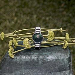 Изумрудный оттенок зеленого циферблата гармонично дополняет теплый металлический блеск инновационной плазменной керамики, которая отличается легкостью и устойчивостью к появлению царапин. Часы оснащены сапфировым стеклом с антибликовым покрытием.\