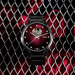 В часах Rado True Secret Ceramic безупречность керамики черного цвета объединяется с чувственным красным — цветом любви. Красный цвет присутствует на циферблате в виде мерцающих оттенков от темно-вишневого до черного. Цветовой градиент от насыщенного к более светлому подчеркивает мистическую ауру этих часов, чей секрет становится явью на 12-часовом делении. Сквозь маленькое круглое отверстие открывается часовой механизм: чутко сбалансированный и живой.