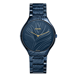 Для своих часов из коллекции True Thinline Евгения выбрала глубокий благородный синий цвет. По ее мнению, он имеет большое философское и символическое значение и является олицетворением мудрости, благородства и духовности. Насыщенный глубокий цвет подчеркнут при помощи контрастных стрелок цвета розового золота и металлизированного логотипа компании Rado.