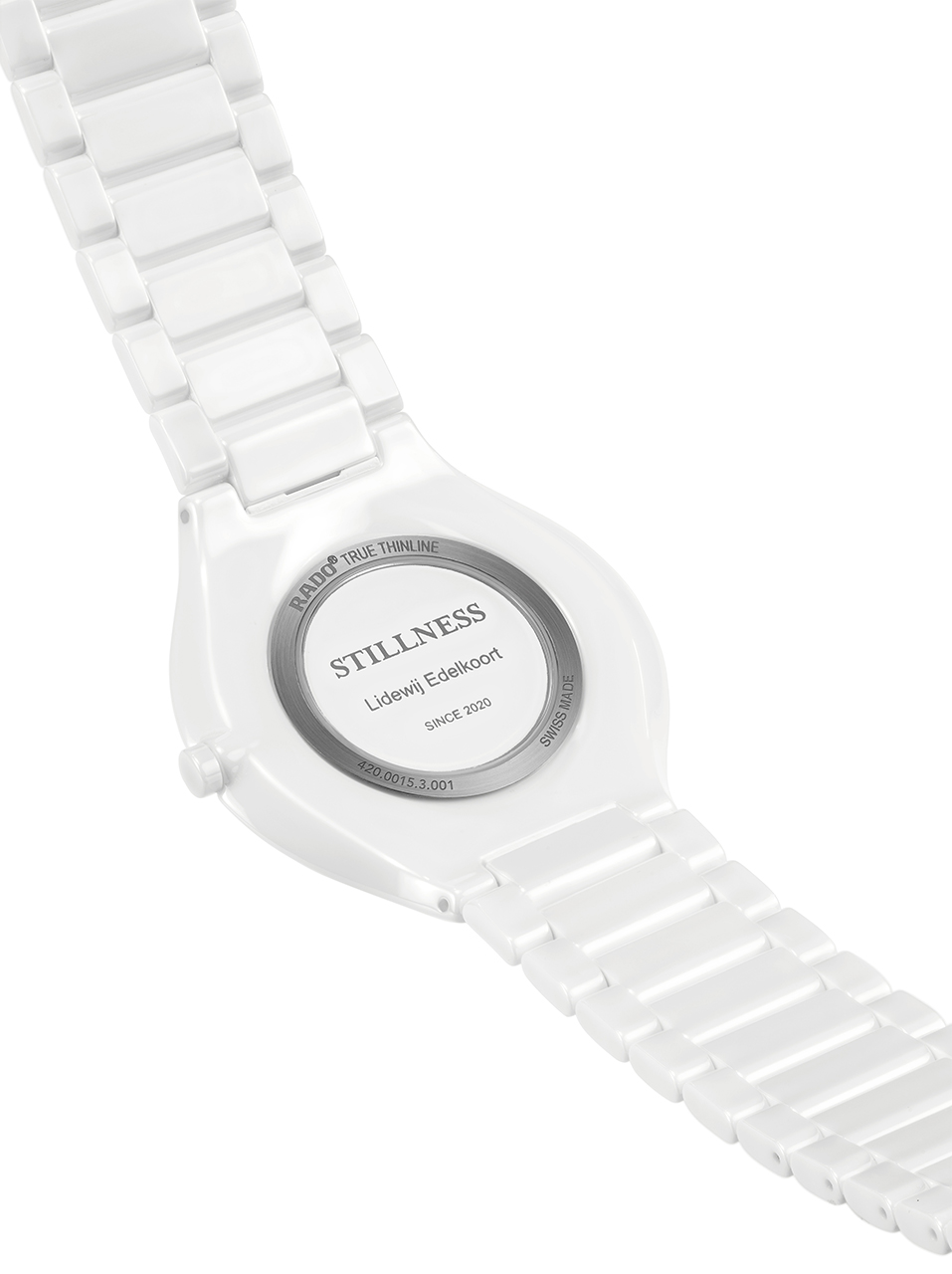 В целом новая модель является современной интерпретацией дизайнерской концепции «меньше — значит больше». Корпус из высокотехнологичной керамики теплого белого цвета имеет толщину 5 мм и диаметр 39 мм, оснащен задней крышкой из титана и сапфирового стекла с надписью «STILLNESS Lidewij Edelkoort SINCE 2020». Циферблат белого цвета виден сквозь выпуклое сапфировое стекло с матовым белым эффектом. Часовая и минутная стрелки белого цвета, прозрачный логотип Rado и браслет из высокотехнологичной керамики белого цвета дополняют монохромный вид этих современных кварцевых часов швейцарского производства.