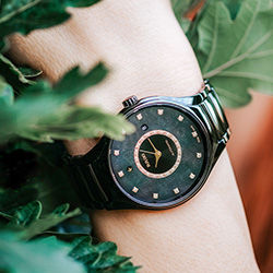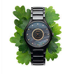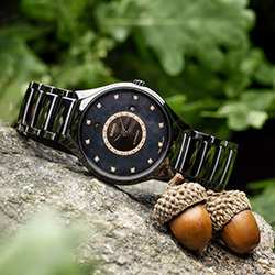 У модели Chapter 3 («Глава 3»), в основе дизайна которой листья дуба, своя особая изысканность. Дуб — одно из самых любимых деревьев в мире, символ вечности, мудрости. На переливающемся от черного до изумрудного цвета перламутровом циферблате искусно выгравированы листья дуба. Бриллиантовые индексы дополнены центральной окружностью из 24 бриллиантов. Часы из гладкой и прохладной высокотехнологичной керамики — это комфорт и новаторские решения.