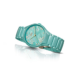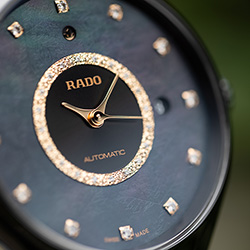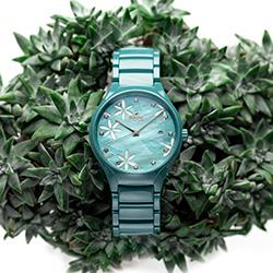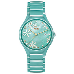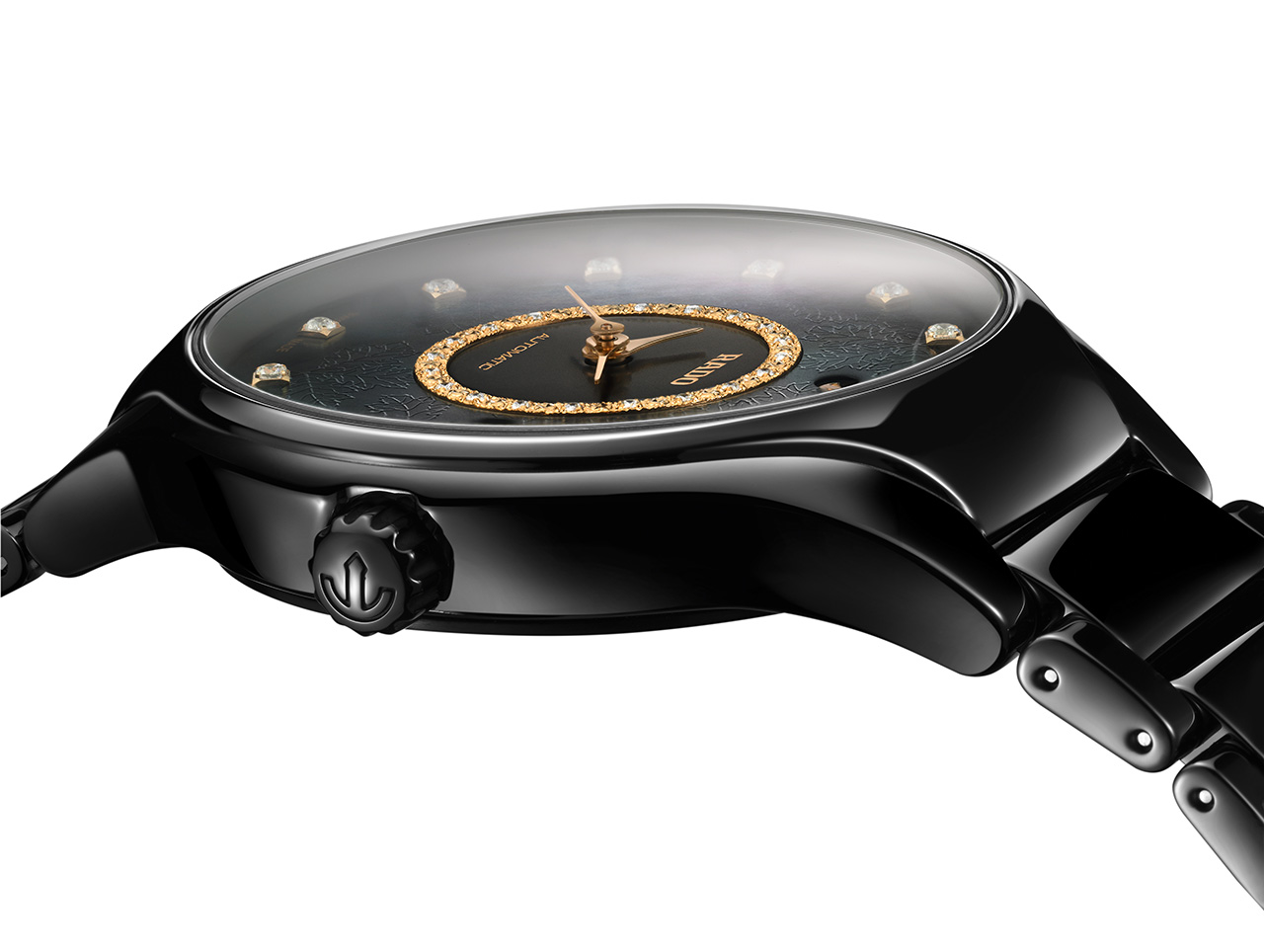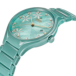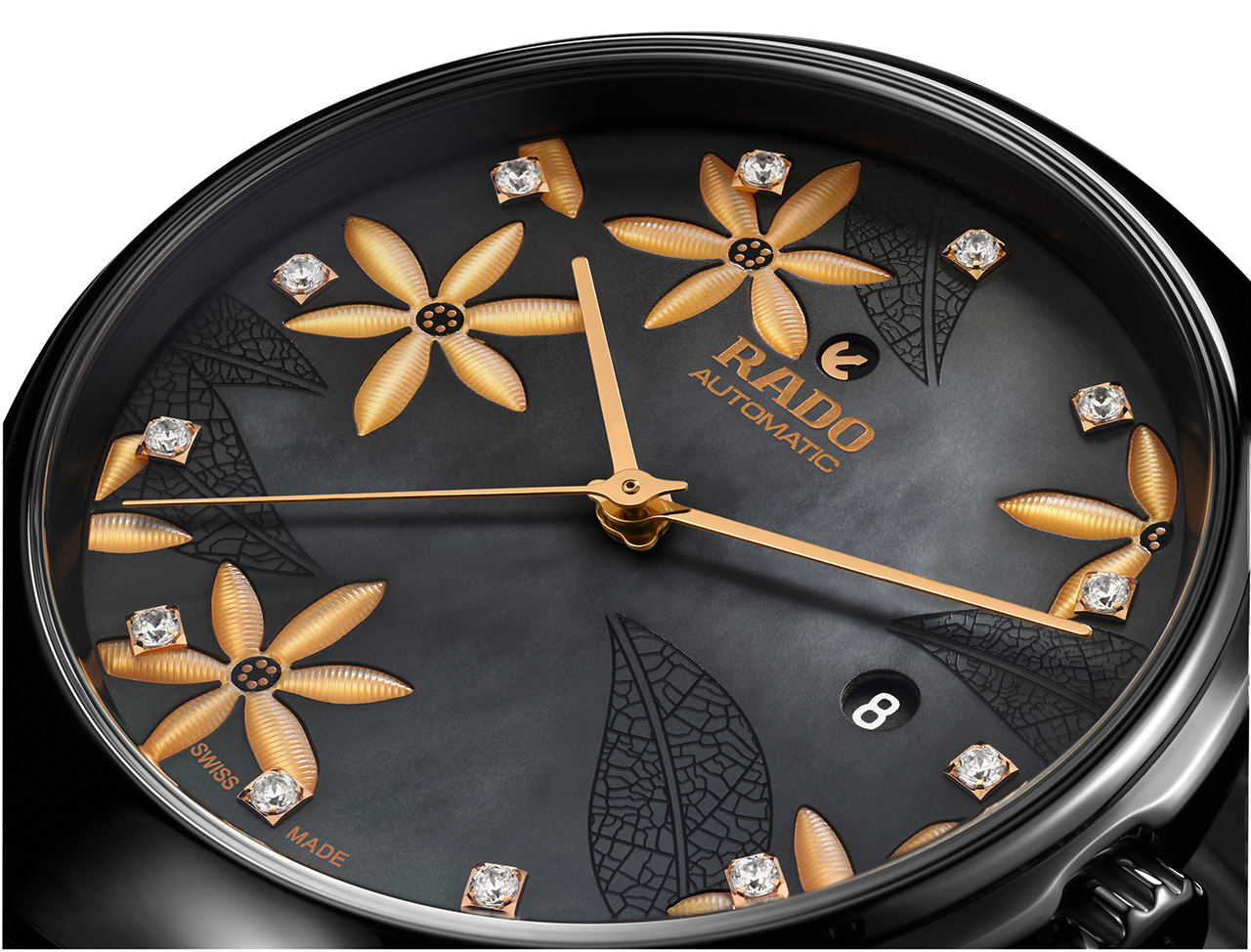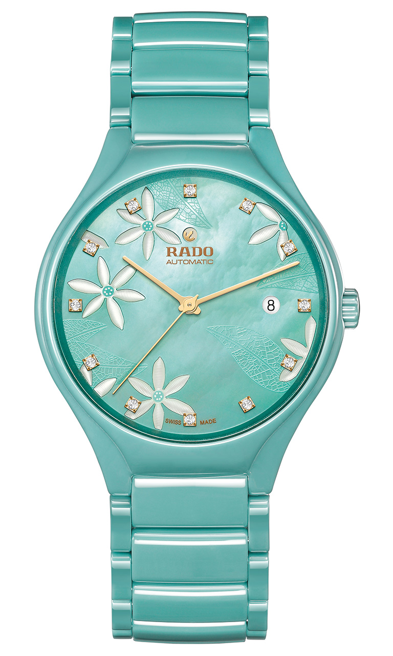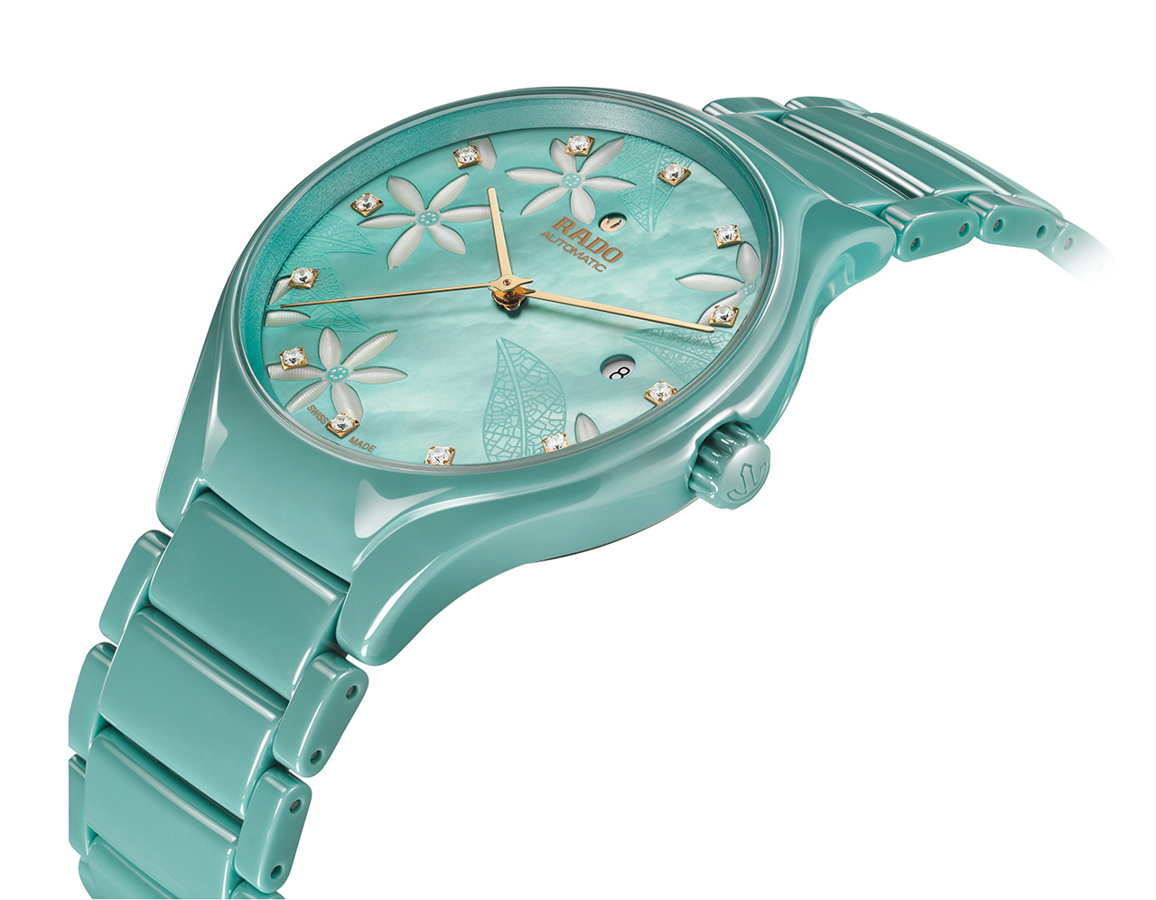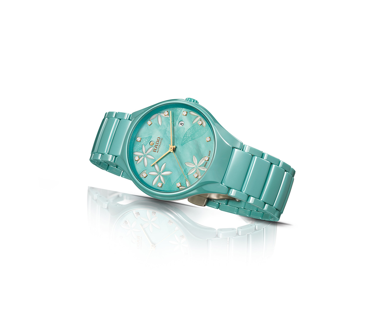 Первая из моделей Chapter 1 («Глава 1») — часы, корпус и браслет которых выполнены из керамики яркого бирюзового, нового для Rado цвета. Перламутровый бирюзовый циферблат искусно украшен филигранными листочками из перегородчатой эмали в технике клуазонне и цветами жасмина, и дополнен стрелками цвета розового золота. 12 бриллиантовых делений придают изысканное сияние циферблату, который покрыт сапфировым стеклом с двусторонним антибликовым покрытием. Задняя крышка корпуса из титана оснащена окошком из дымчатого сапфирового стекла, которое позволяет наблюдать за работой механизма Rado калибра R763 — маленького технического шедевра с запасом хода до 80 часов.